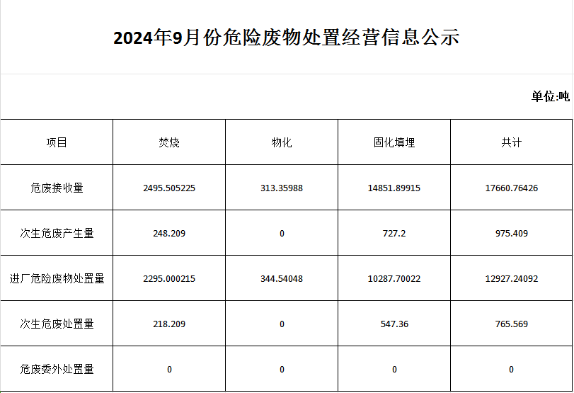 2024年9月份危險(xiǎn)廢物處置經(jīng)營信息公示